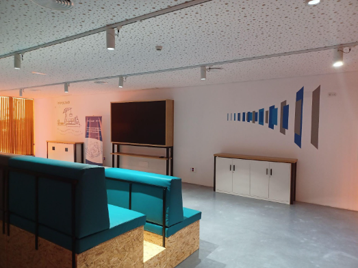 A multifunctional room, mainly destined to the development of diffusion, dissemination and training events or presentations to the public. It has a videowall and all the necessary audiovisual equipment, as well as some benches. Some of the mentoring sessions take place here.