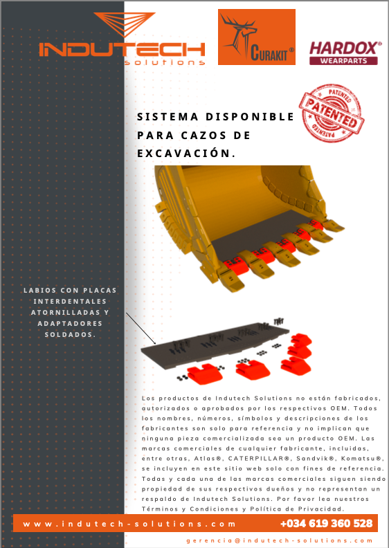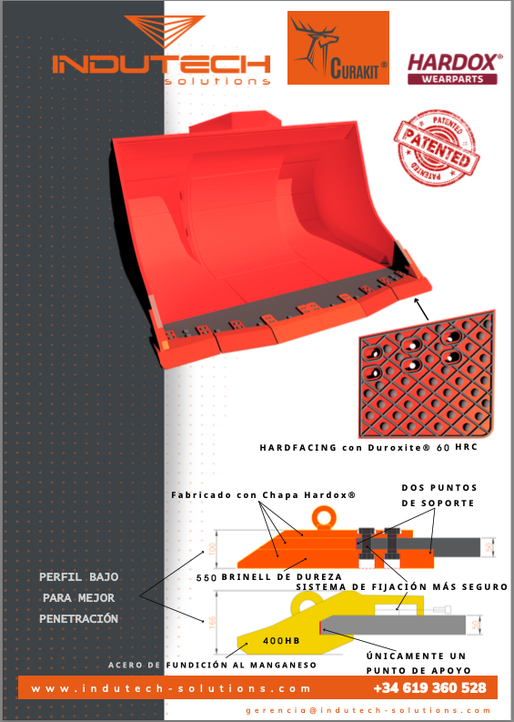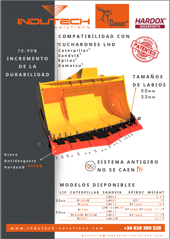 Indutech Solutions desarrolla el producto “Curakit”, que consiste en un labio de protección para cazos de palas cargadoras (LHD), empleadas en la minería, así como en puertos para la logística de graneles y concentrados de minerales. Permite alargar la vida del cazo, reduciendo el consumo de combustible, así como el desgaste de neumáticos y transmisiones.